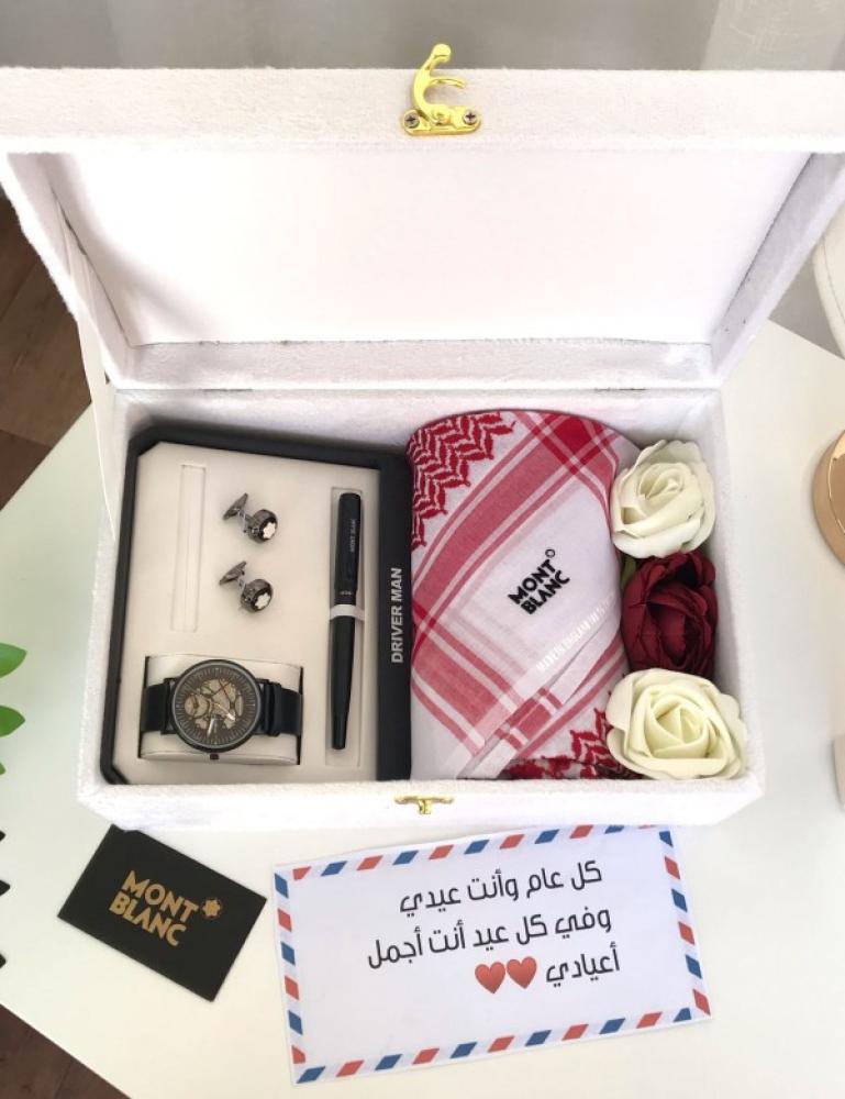 طقم رجالي أنيق وفاخر يحتوي على شماغ مونت بلانك، ساعة بتصميم مميز، قلم، كبك، ورد صناعي، وبطاقة معايدة داخل صندوق أبيض مبطن. مناسب كهدية فخمة للمناسبات مثل الأعياد والتخرج والنجاح.